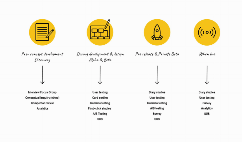 Alpha: In this phase, one can conduct pop-up research, also called guerrilla research which is a quick user testing session in which you test screens and prototypes with real users in their natural environment